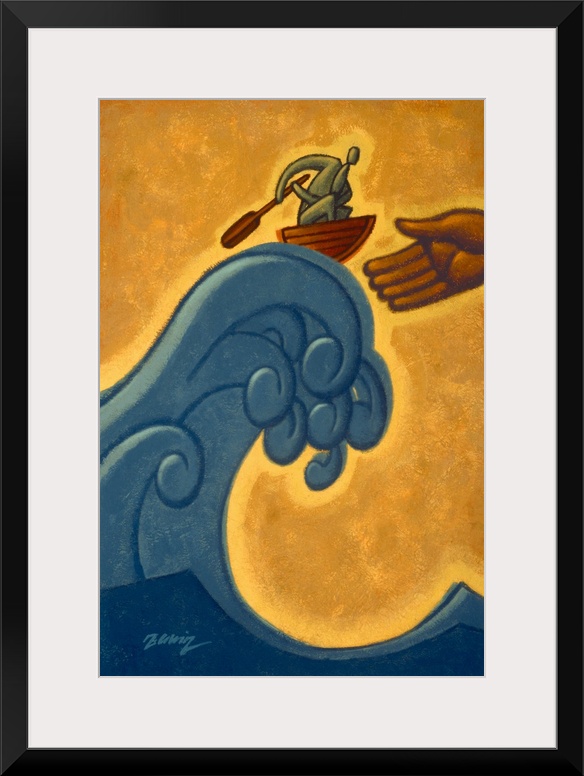 <p>Contemporary painting of a man in a boat riding a big wave, an outstretched hand reaching out to rescue him.</p>