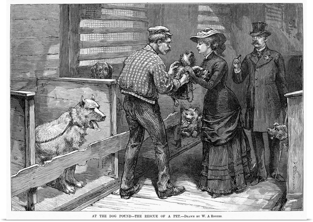 <p>New York, Dog Pound, 1883. The Rescue Of A Pet At the Dog Pound In New York City. Wood Engraving, American, 1883, After A Drawing By W.A. Rogers.</p>