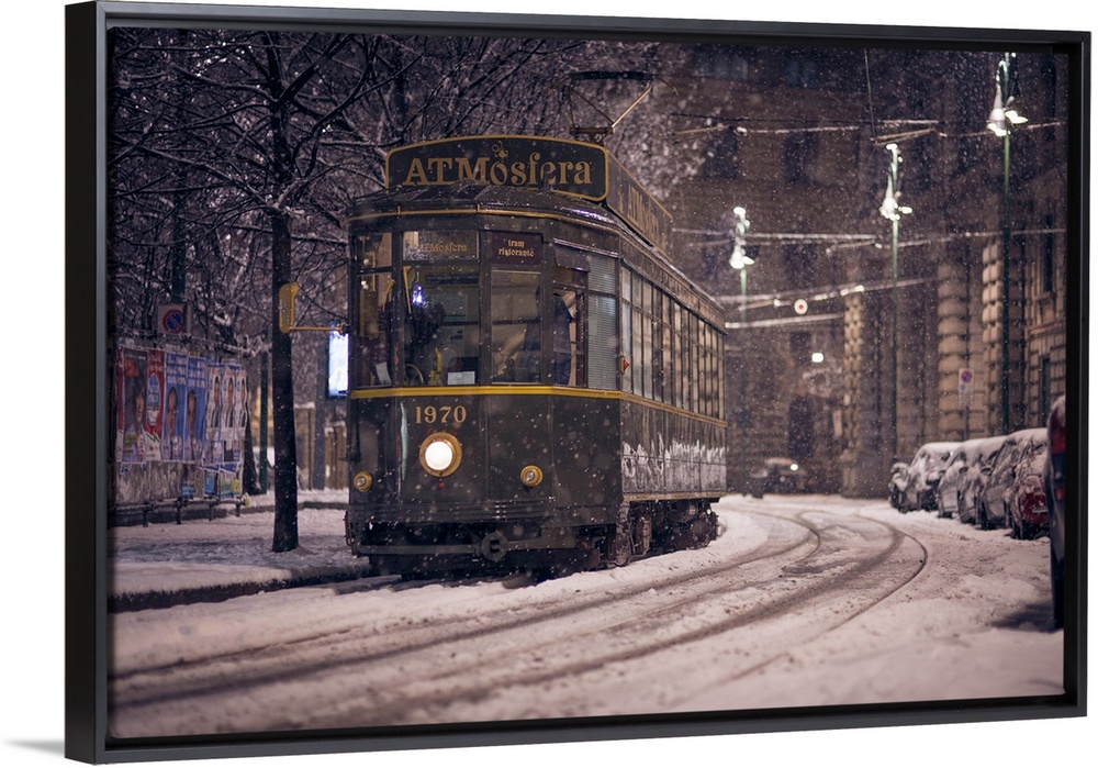 <p>The restaurant tram "ATMosfera" traveling in Piazza Castello in Milano during a heavy snowfall. Lombardy, Italy</p>