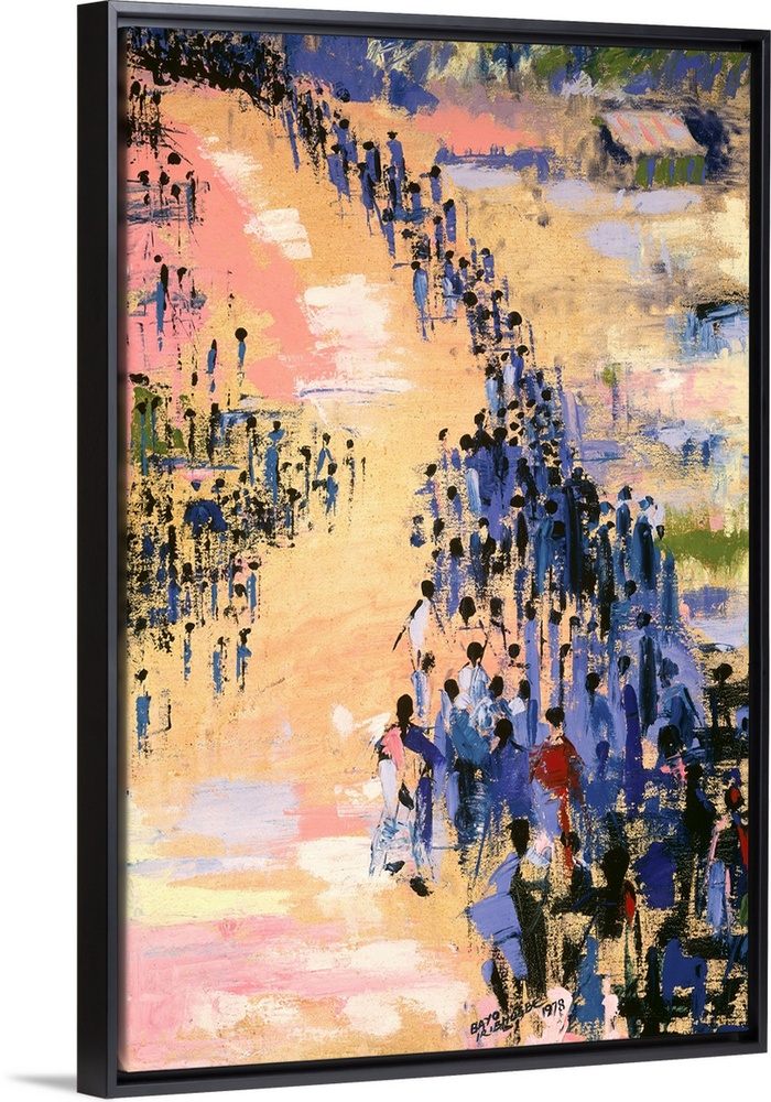 <p>This vertical painting depicts a scene that is an exodus of abstract black figures progressing towards the horizon in this African artwork.</p>