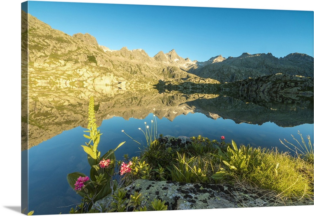 <p>The rhododendrons frame the blue water of Lago Nero at dawn, Cornisello Pinzolo, Brenta Dolomites, Trentino-Alto Adige, Italy</p>