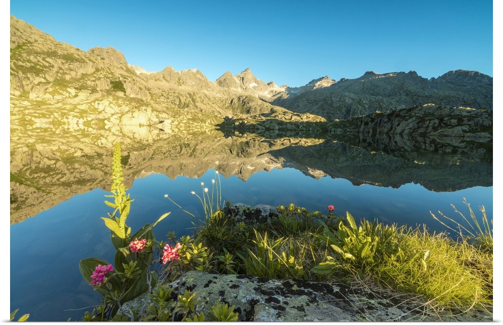 <p>The rhododendrons frame the blue water of Lago Nero at dawn, Cornisello Pinzolo, Brenta Dolomites, Trentino-Alto Adige, Italy</p>