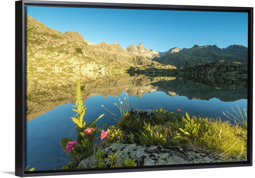 <p>The rhododendrons frame the blue water of Lago Nero at dawn, Cornisello Pinzolo, Brenta Dolomites, Trentino-Alto Adige, Italy</p>