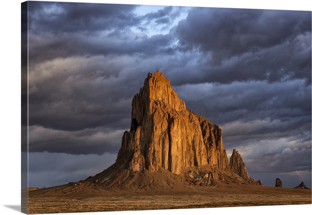 <p>Storm clouds gather over Shiprock, New Mexico. The rising suns illuminates this sacred rock of Navajo people, Shiprock, New Mexico, united states of America.</p>