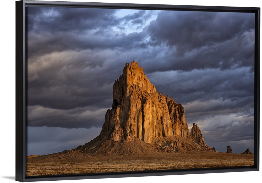 <p>Storm clouds gather over Shiprock, New Mexico. The rising suns illuminates this sacred rock of Navajo people, Shiprock, New Mexico, united states of America.</p>