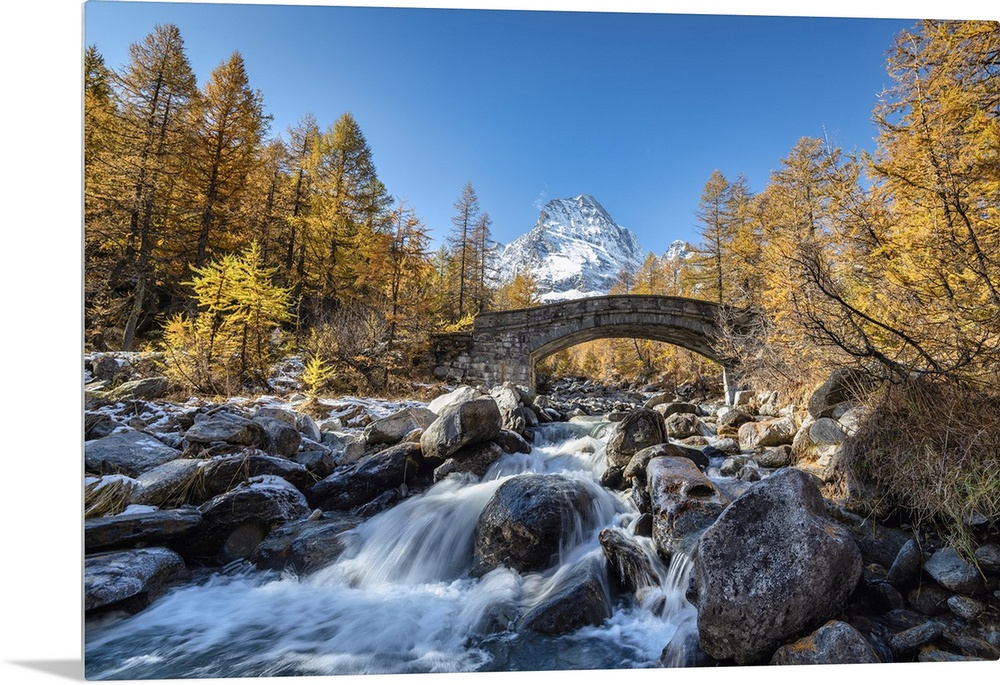 <p>The river Cairasca and Monte Leone in the background during autumn, Alpe Veglia, Val Cairasca valley, Divedro valley, Ossola valley, Varzo, Piedmont, Italy. Piedmont, Western Europe, Italy.</p>