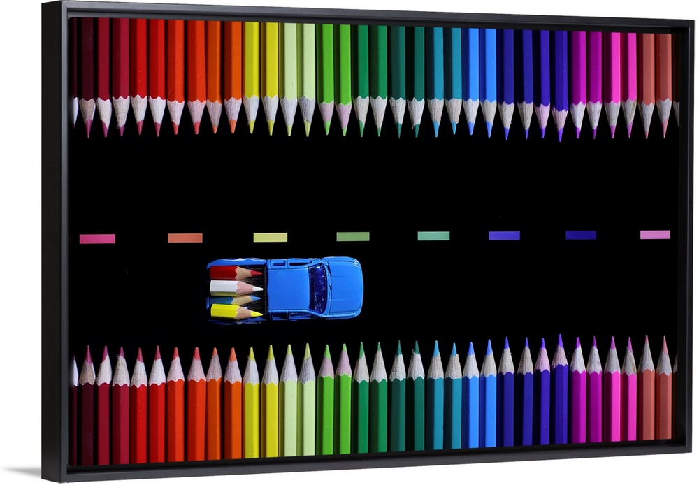 <p>Conceptual photograph of a two truck hauling tiny colored pencils like lumber along a colored pencil lined road.</p>