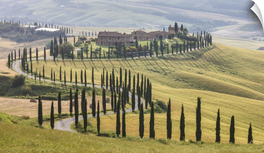 <p>The road curves in the green hills surrounded by cypresses, Crete Senesi, Province of Siena, Tuscany, Italy</p>