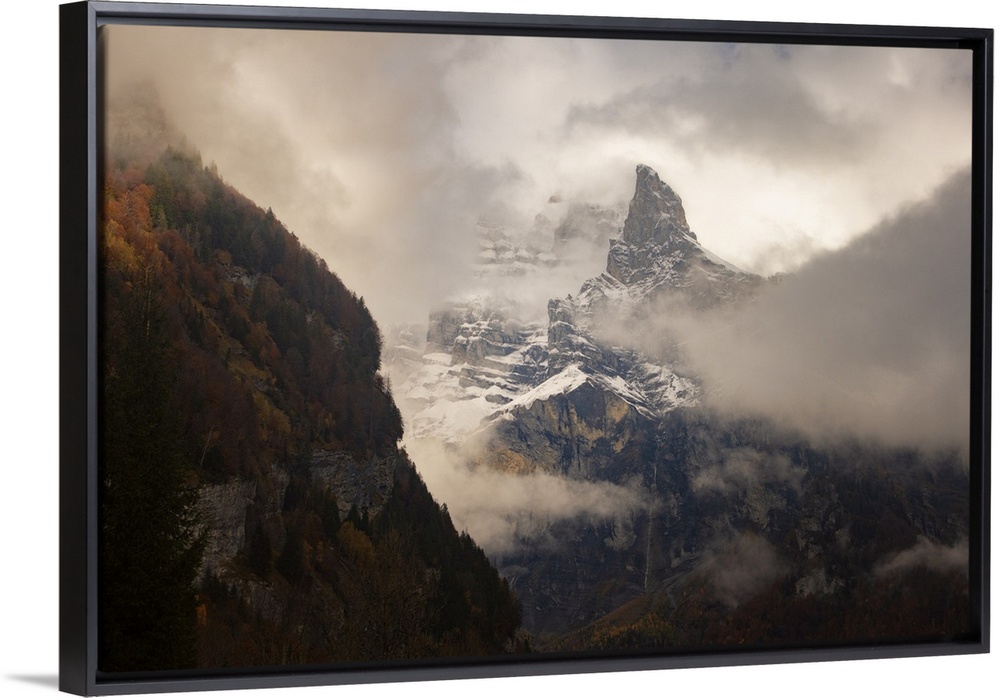 <p>Place of Sixt-Fer-a-Cheval area in Savoie, France, big rocky mountain with snow going throw the fog at fall with colored trees on the left side.</p>