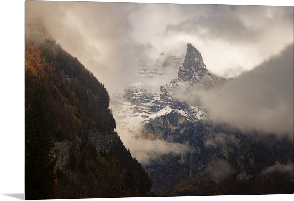 <p>Place of Sixt-Fer-a-Cheval area in Savoie, France, big rocky mountain with snow going throw the fog at fall with colored trees on the left side.</p>