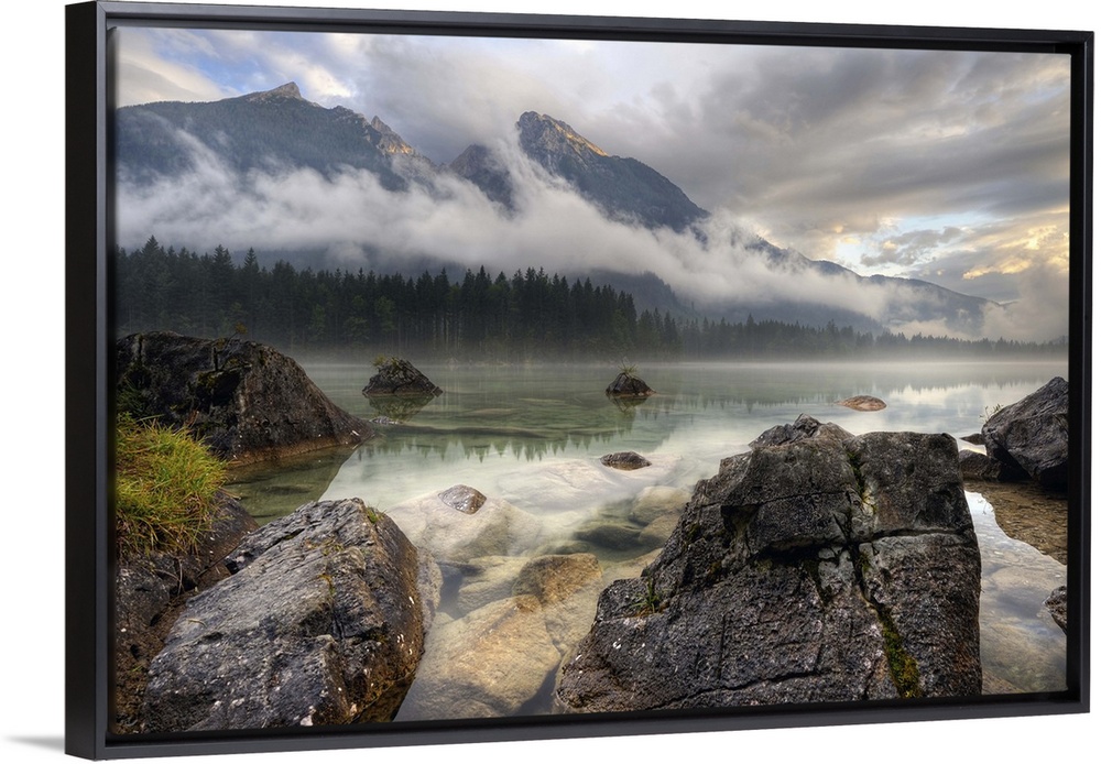 <p>Rocks on the shore of a lake below mountains obscured by clouds, Germany.</p>