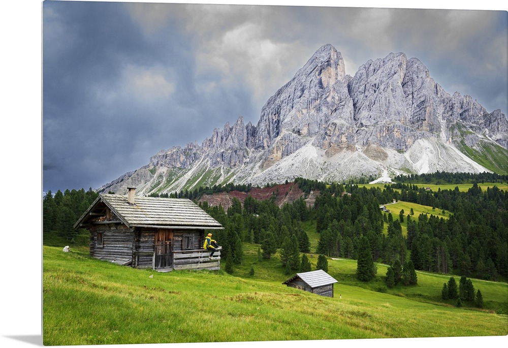 <p>Side view of a hiker on chalet in green meadows admiring the rocky massif of Sass de Putia, Passo delle Erbe, Dolomites, Puez Odle, Bolzano district, South Tyrol, Italy, Europe</p>
