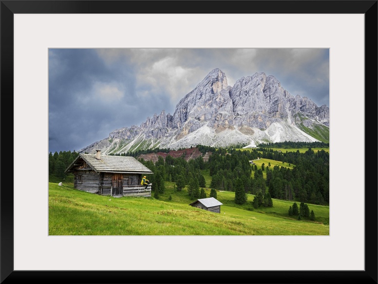 <p>Side view of a hiker on chalet in green meadows admiring the rocky massif of Sass de Putia, Passo delle Erbe, Dolomites, Puez Odle, Bolzano district, South Tyrol, Italy, Europe</p>