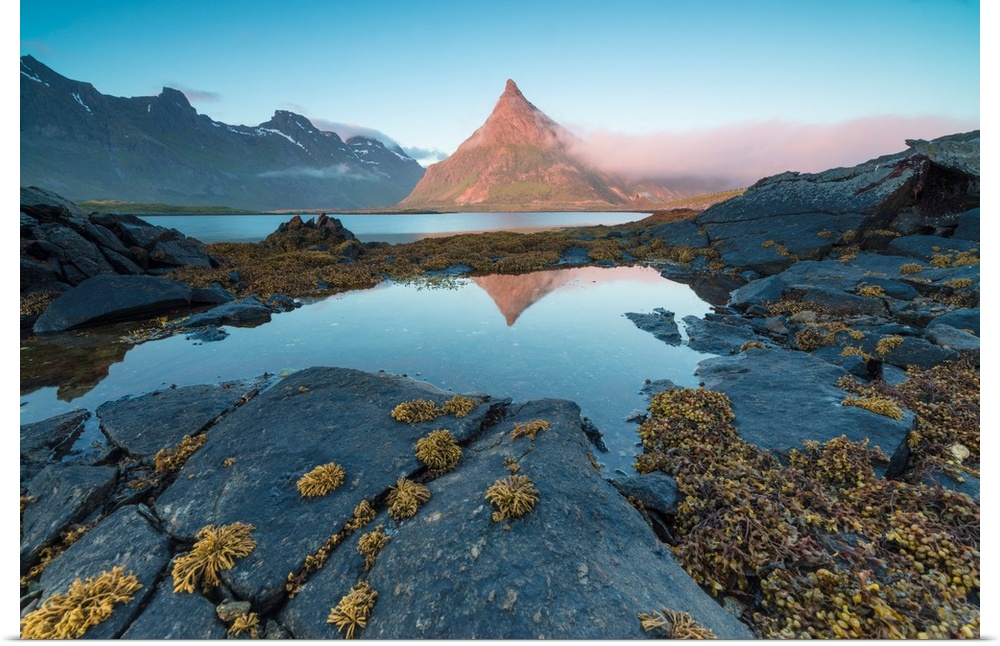 <p>The rocky peak of Volanstinden lighted up by the midnight sun is reflected in blue sea Fredvang Lofoten Islands Norway Europe</p>
