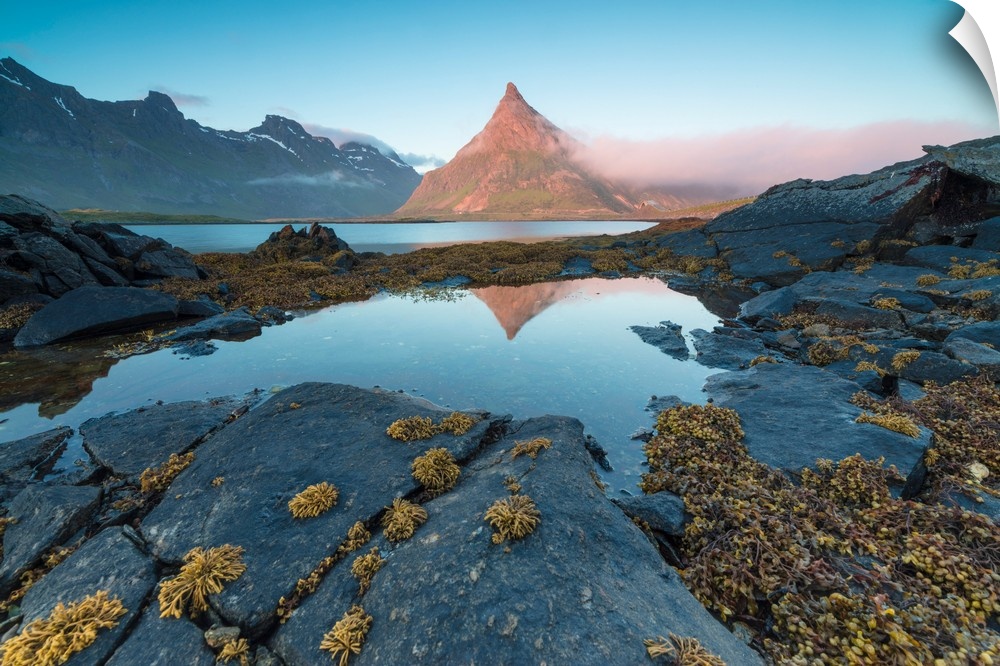 <p>The rocky peak of Volanstinden lighted up by the midnight sun is reflected in blue sea Fredvang Lofoten Islands Norway Europe</p>