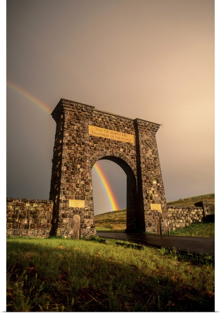 <p>The Roosevelt Arch, Gardiner, Montana, in Yellowstone National Park, Wyoming, United States of America. The Roosevelt Arch was built from rough blocks of columnar basalt, which were quarried near the water tower in Gardiner, Montana, It was dedicated by President Theodore Roosevelt in April 1903 and finished shortly thereafter. For 100 years now it has stood and welcomed the world to the first National Park and to one of the finest areas of wild land remaining on this continent. The arch with the rich rainbow glowing beyond the glistening wet rock, symbolizes for me that a paradise still awaits visitors in Yellowstone.</p>