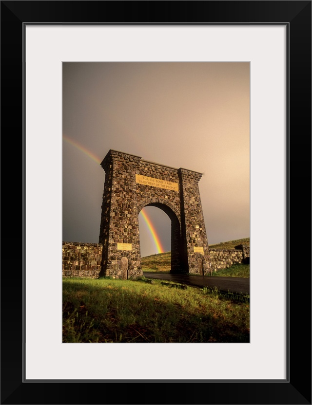 <p>The Roosevelt Arch, Gardiner, Montana, in Yellowstone National Park, Wyoming, United States of America. The Roosevelt Arch was built from rough blocks of columnar basalt, which were quarried near the water tower in Gardiner, Montana, It was dedicated by President Theodore Roosevelt in April 1903 and finished shortly thereafter. For 100 years now it has stood and welcomed the world to the first National Park and to one of the finest areas of wild land remaining on this continent. The arch with the rich rainbow glowing beyond the glistening wet rock, symbolizes for me that a paradise still awaits visitors in Yellowstone.</p>