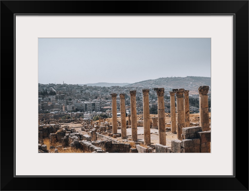 <p>The ruins of a Roman temple, with the modern city of Jerash in the background, Jerash, Jordan, Middle East</p>