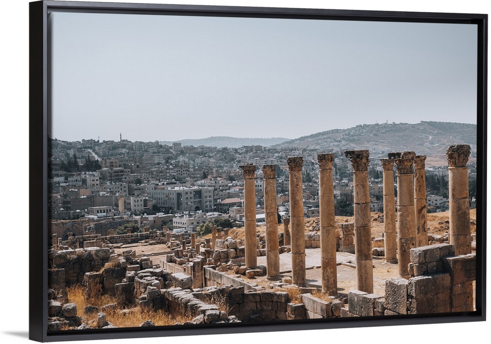<p>The ruins of a Roman temple, with the modern city of Jerash in the background, Jerash, Jordan, Middle East</p>