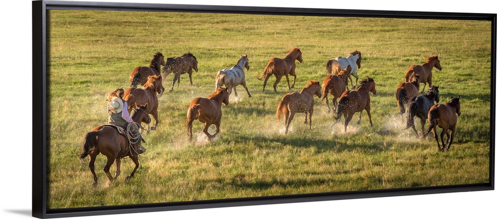 <p>Photograph of a cowgirl with a lasso herding horses through a field.</p>