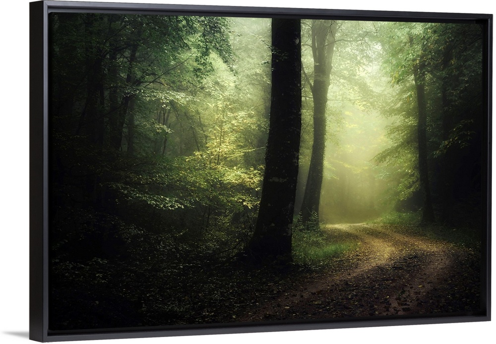<p>Photograph taken inside a dense forest that has a road cutting through with fog in the distance.</p>