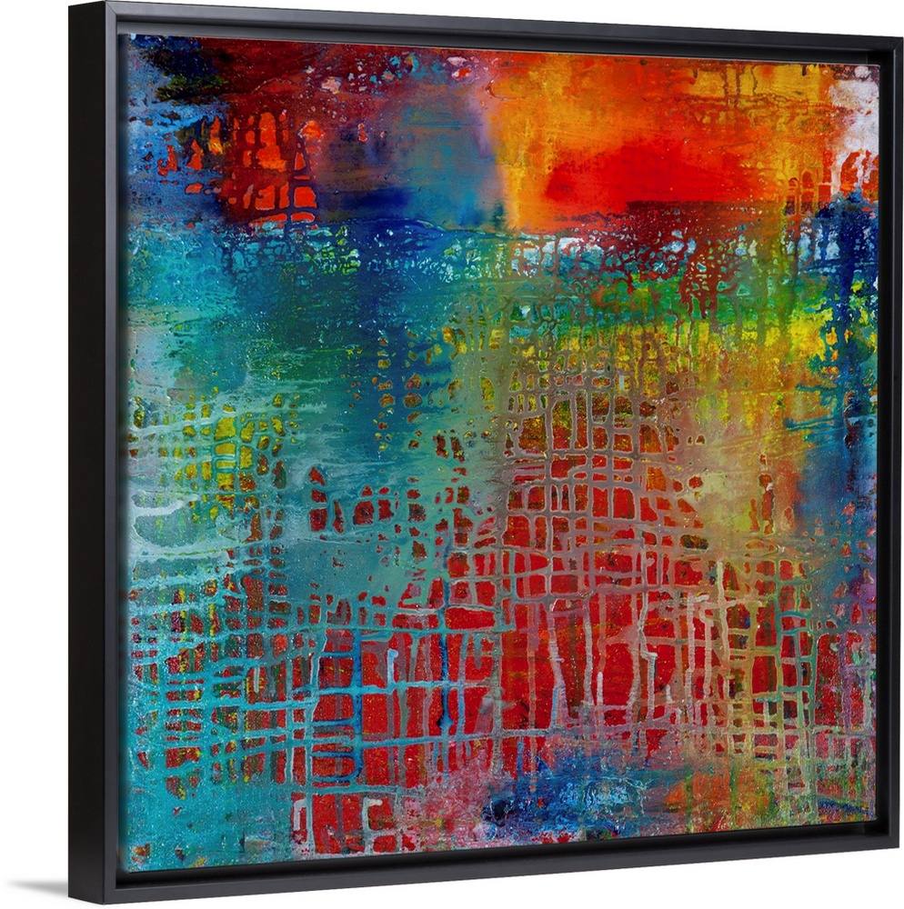 <p>Contemporary abstract painting in rainbow colors, with criss-crossing paint.</p>