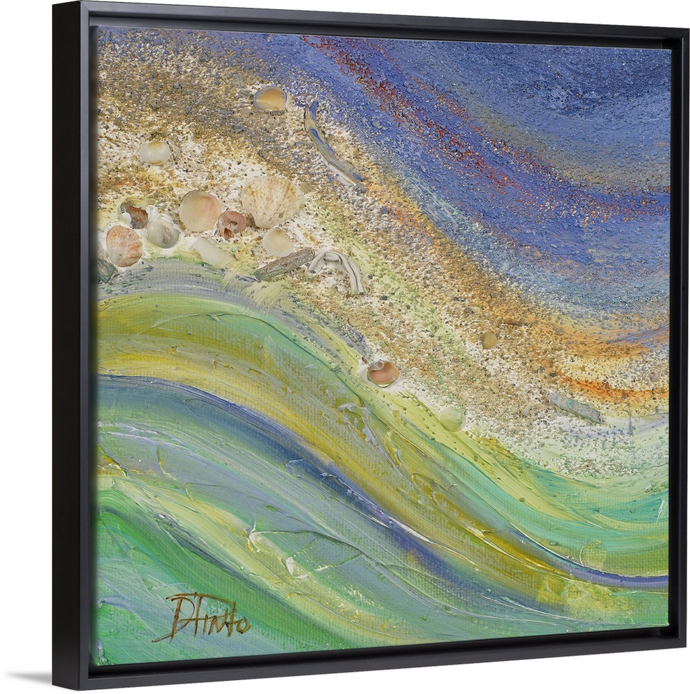 <p>Square painting of the ocean meeting a beach with shells on canvas.</p>