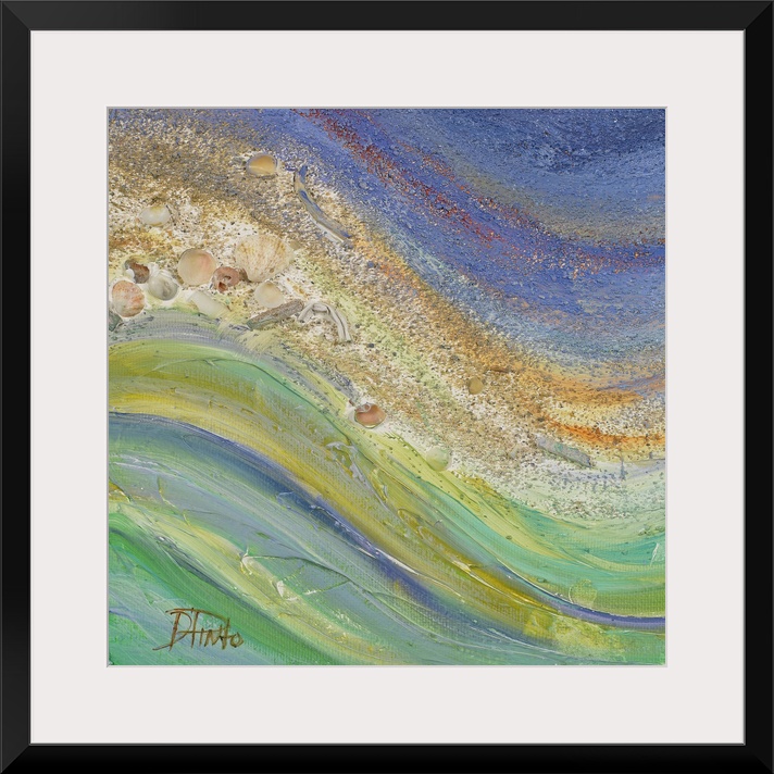 <p>Square painting of the ocean meeting a beach with shells on canvas.</p>