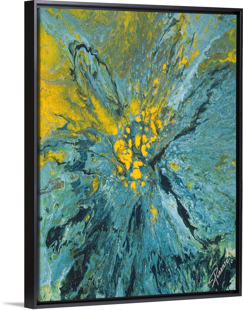 <p>Abstract painting that depicts a blue and yellow paint explosion on to canvas.</p>