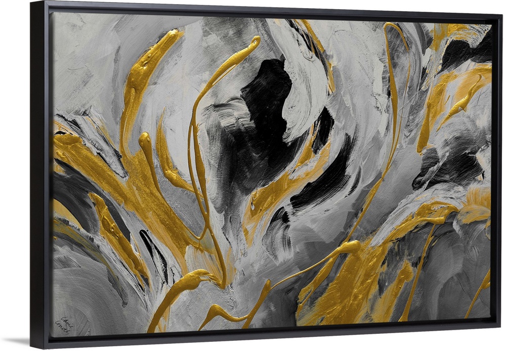<p>A contemporary abstract painting that has shades of gray and black with thick, bright, gold designs.</p>