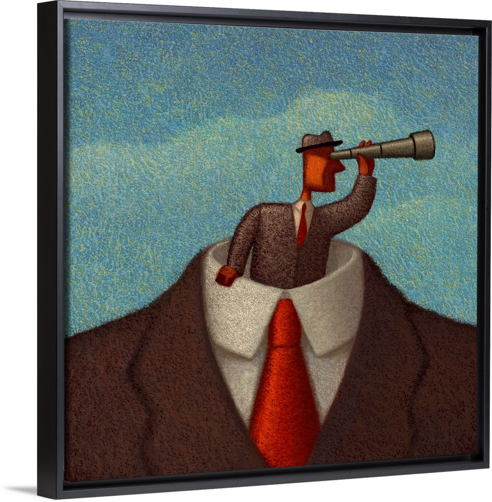 <p>Conceptual painting of a figure standing within a giant suit with a telescope looking forward. Symbolic of a David vs. Goliath.</p>