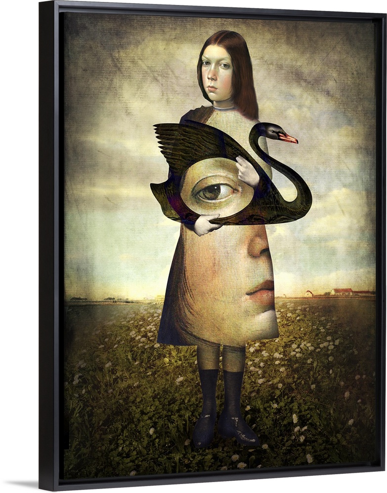 <p>A vertical abstract portrait of a female holding a black swan.</p>
