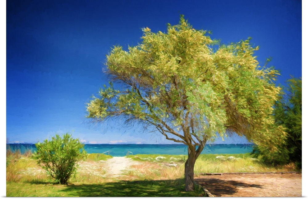 <p>Photo painting of a lush green tree blowing in the wind with a sandy path leading to the ocean in the background.</p>