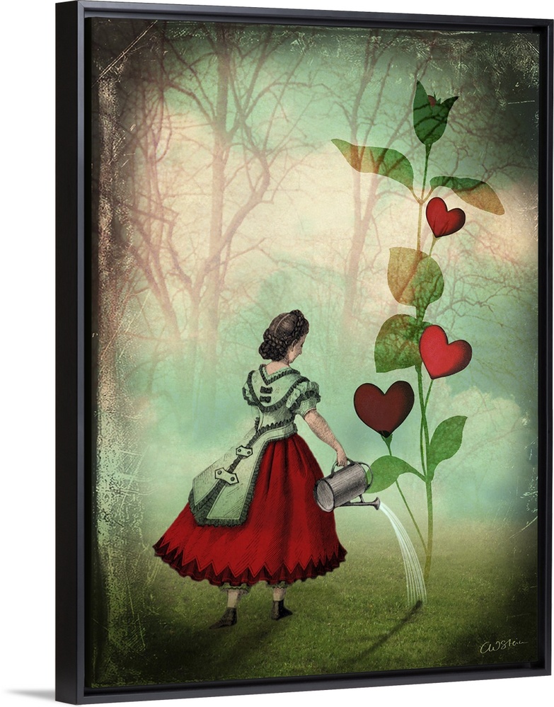<p>A lady is watering a plant that is blooming hearts on it's vine.</p>