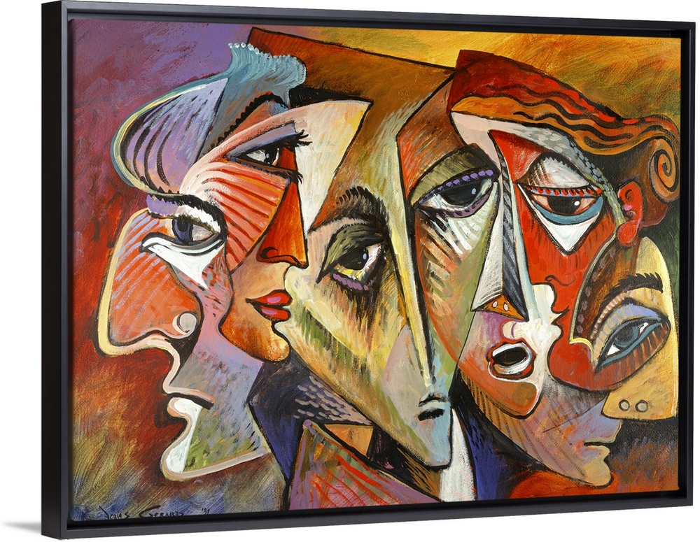 <p>Contemporary, figurative art of multiple faces clustered together created by abstract lines and angles so that they appear to be melting in to each other.</p>