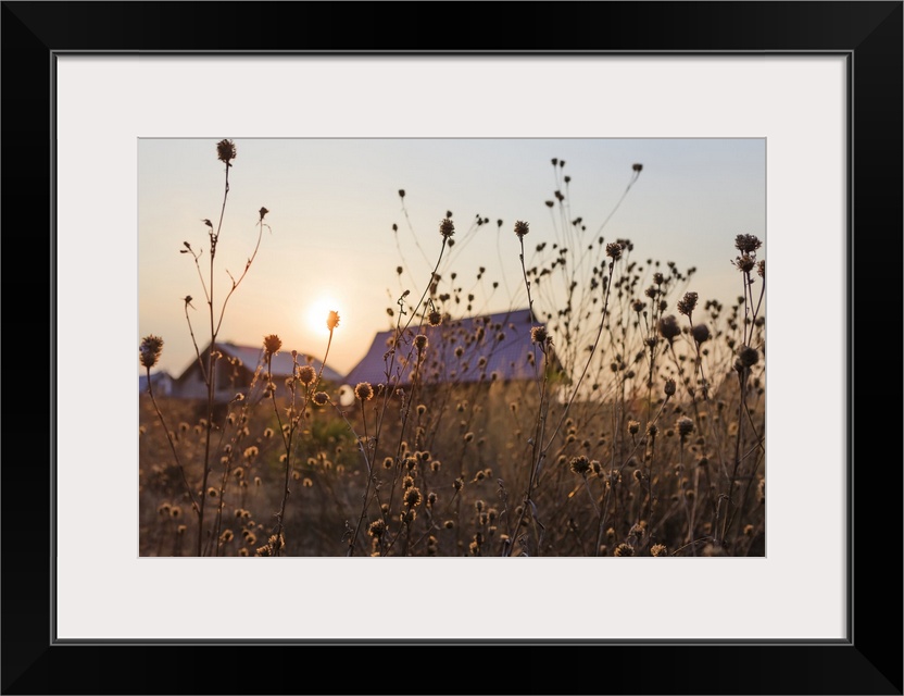 <p>The setting sun over the summer houses in a village with tall grasses in the foreground; Tarusa, Russia</p>