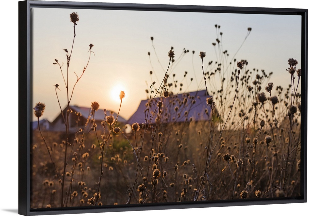 <p>The setting sun over the summer houses in a village with tall grasses in the foreground; Tarusa, Russia</p>