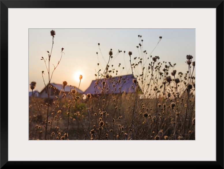 <p>The setting sun over the summer houses in a village with tall grasses in the foreground; Tarusa, Russia</p>