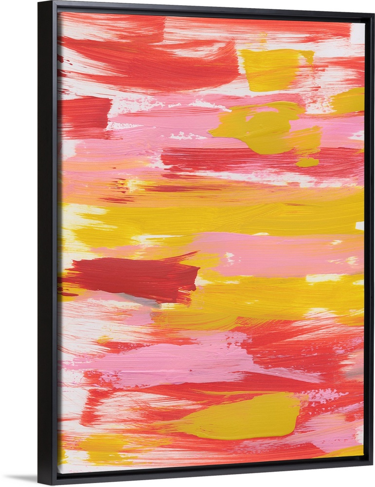 <p>Vertical abstract painting of sweeping horizontal brush strokes in yellow, pink and red.</p>