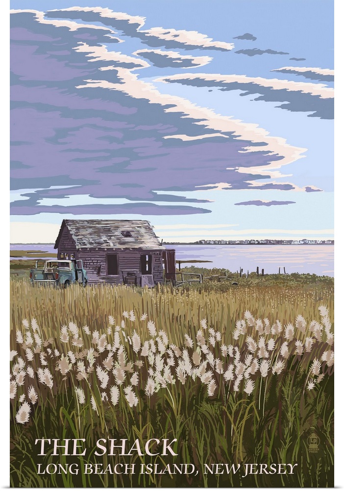 <p>Retro stylized art poster of a field of tall grass with an old shack, under a cloudy sky.</p>