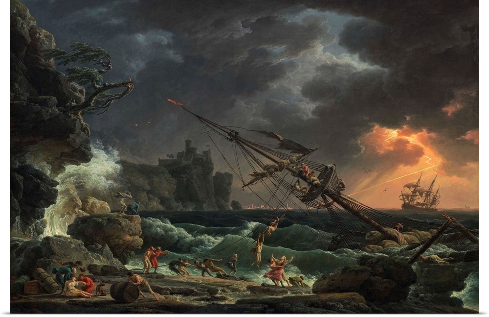 <p>The Shipwreck, by Claude-Joseph Vernet, 1772, French painting, oil on canvas. People escape on a life line from a storm wrecked ship on a rocky shore. Survivors on shore attempt to retrieve some cargo</p>