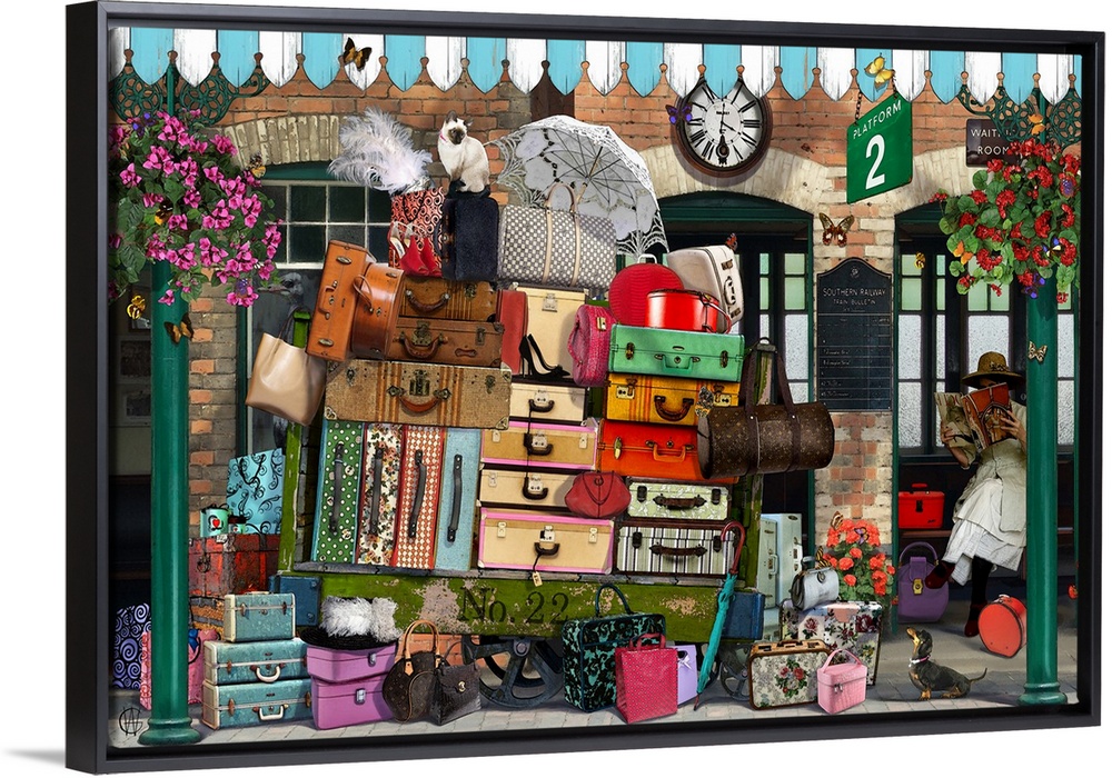 <p>Illustration of a woman reading a magazine at a train station with a ton of luggage, which has a cat on top and a dog next to it, after a long day of shopping.</p>