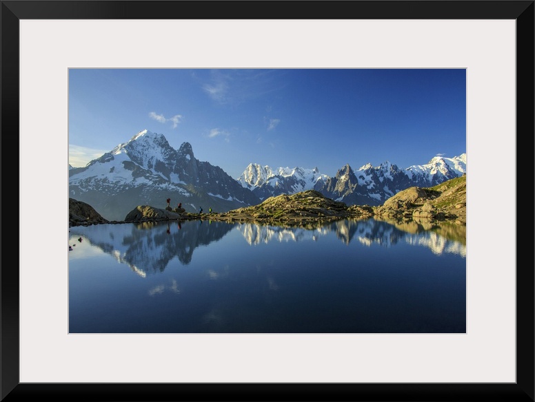 <p>Photographers and hikers on the shore of Lac De Cheserys at dawn, Haute Savoie, France, Europe.</p>