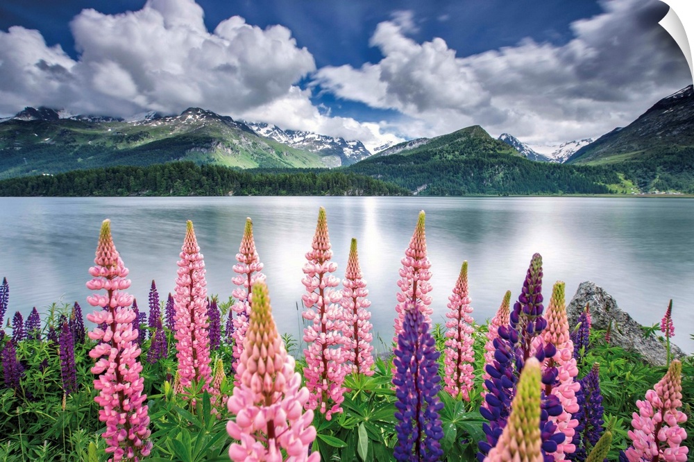 <p>Blooming of lupins on the shores of Lake Sils. Engadine. Canton of Graubunden. Switzerland.</p>