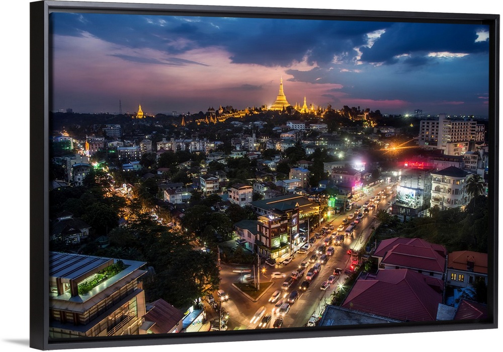 <p>The Shwedagon Pagoda and nearby homes after dark in Yangon.</p>