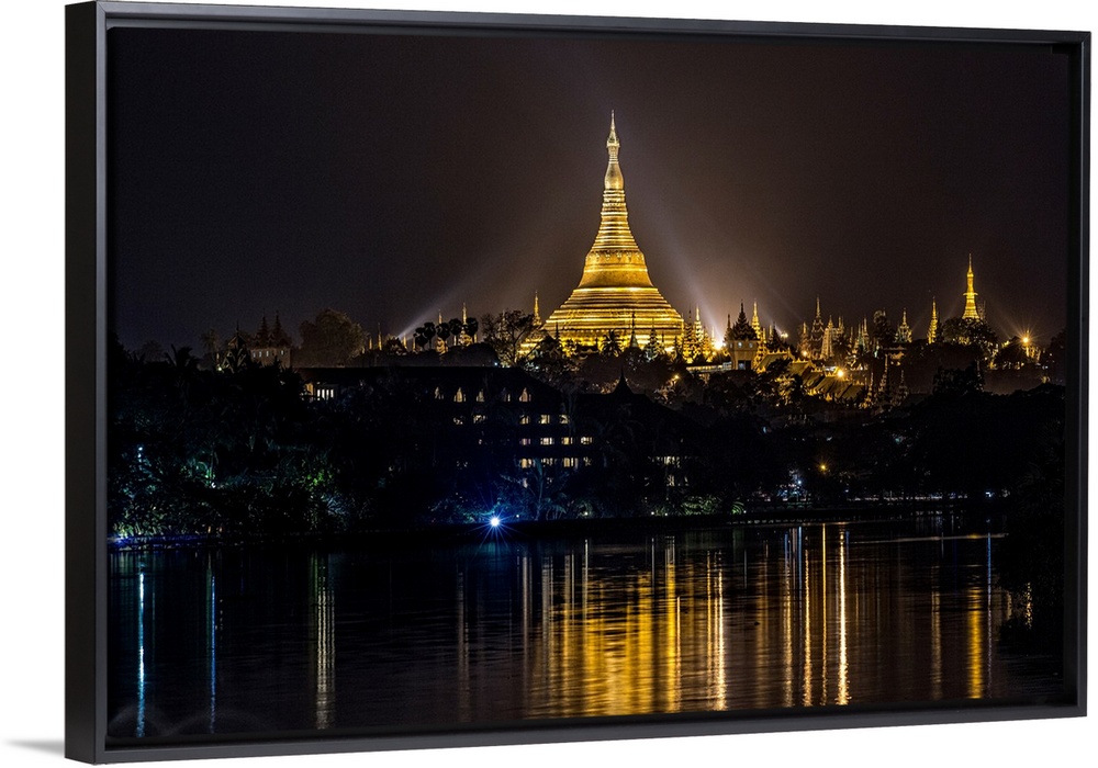 <p>The Shwedagon Pagoda reflecting in the water after dark in Yangon.</p>