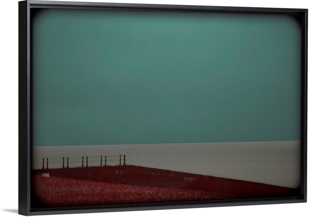<p>Minimalist photograph of a red landing leading up to a calm, gray sea with a turquoise sky and dark vignetted sides.</p>