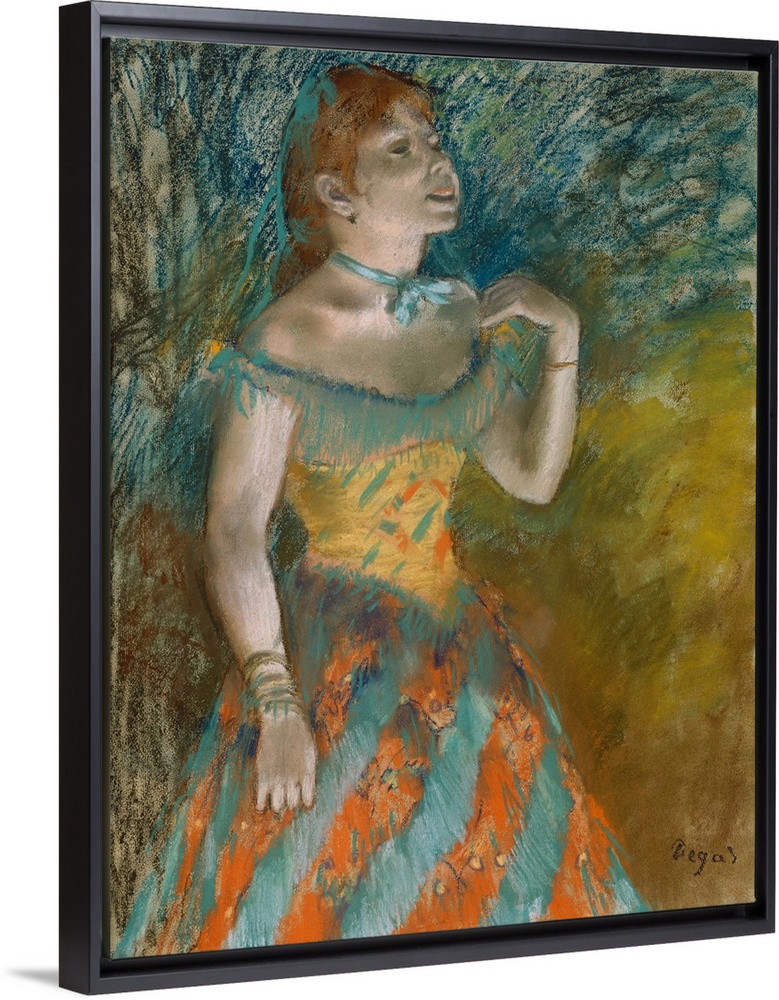 <p>A sale catalogue of 1898 evocatively described the performer pictured in this pastel: Skinny and with the graceful moves of a little monkey, she has just sung her ribald verses and, with a gesture that conceals an entreaty behind her smile, is inviting applause. With her small eyes, high cheeks, and low brow, the model recalls Marie von Goethem, the working-class girl who posed for Degas's sculpture?The Little Fourteen-Year-Old Dancer. The singer's dress, rendered in vivid yellow, turquoise, and orange, reflects the artist's experimentation with saturated hues and color contrasts in the mid-1880s.</p>