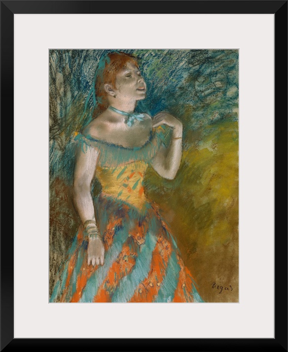 <p>A sale catalogue of 1898 evocatively described the performer pictured in this pastel: Skinny and with the graceful moves of a little monkey, she has just sung her ribald verses and, with a gesture that conceals an entreaty behind her smile, is inviting applause. With her small eyes, high cheeks, and low brow, the model recalls Marie von Goethem, the working-class girl who posed for Degas's sculpture?The Little Fourteen-Year-Old Dancer. The singer's dress, rendered in vivid yellow, turquoise, and orange, reflects the artist's experimentation with saturated hues and color contrasts in the mid-1880s.</p>