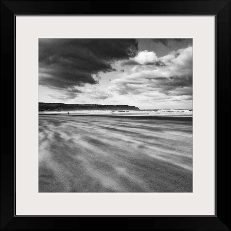 <p>Lone figure walking along windswept beach under stormy skies at Whitby, North Yorkshire, England</p>